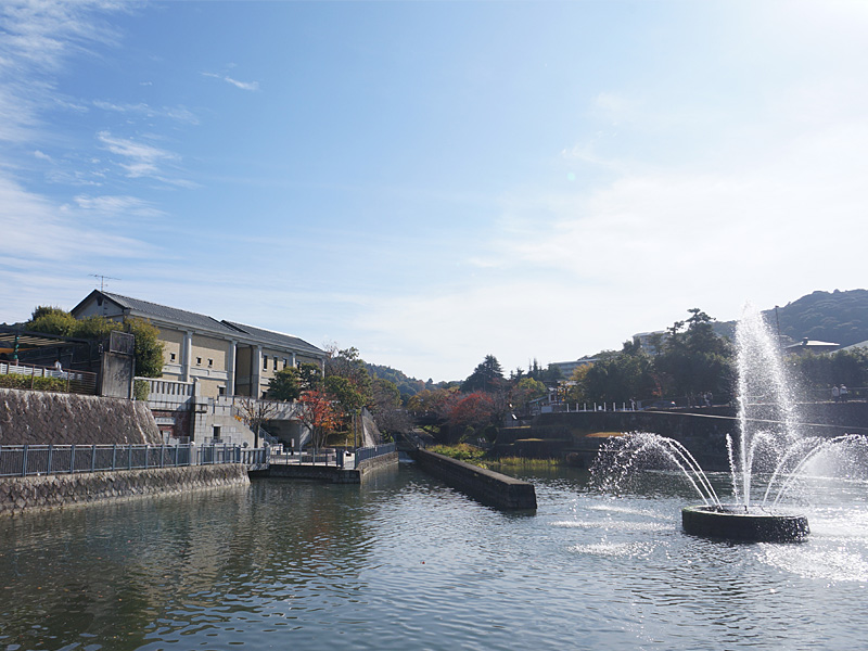 「南禅寺船溜」はインクラインの下部、琵琶湖疎水記念館や京都市動物園の側にある船溜で、蹴上船溜より広い水域となっています。疎水はこの南禅寺船溜を経由してさらに西へ向かってのびており、ここから鴨川に合流するまでの流れを「鴨東運河(おうとううんが)」と呼ぶそうです。現在は中央に噴水が設けられていますが、これはインクラインの高低差を利用して作られたものなんだとか。動力を使わず、自然の水圧だけで噴き上がる噴水です。