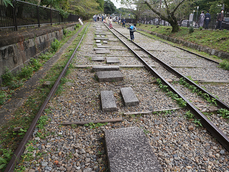蹴上インクラインの他の見どころとして、少し地味ですが廃線跡のレールをよく見てみてください。