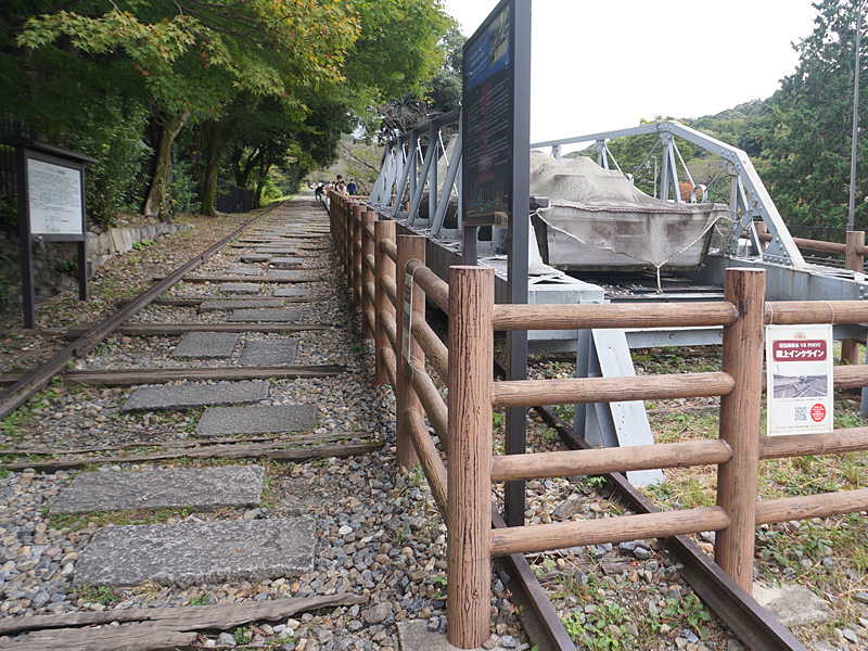 またインクラインの上部と下部には復元された台車と船が展示されています。上部の台車の側には当時の様子を再現したVRが見られる看板が、下部の台車の側にもインクラインの説明が書かれた看板があり、インクラインのしくみが理解しやすい展示となっています。上部から歩いていき橋の下を通り抜けると最終的に南禅寺船溜にたどり着きますが、その手前でインクラインの線路は途切れ、南禅寺船溜に続く水場が現れます。インクラインで運ばれた船がここから再び水路に戻る様子がよくわかりますね。