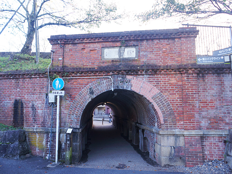 水路閣を見たら、そのまますぐ横の南禅寺を見学してもいいですが拝観料がかかるので、南禅寺法堂正面から西へ三門をくぐって通り、舗装路に出たら南に向かって歩きます。 すると先ほど通った蹴上インクラインに戻ってきます。そしてインクライン下をくぐるように「ねじりまんぽ」が現れます。