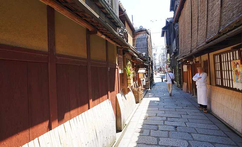 さらに細くなった通りはきれいに舗装された石畳の道になり、その周囲には黒褐色や赤茶の格子窓、立派に手入れされた犬矢来の京町屋が並び、祇園らしい風景を見ることができます。