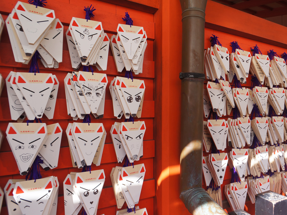 逆三角形の絵馬にはキリっとしたつり目のきつねの顔が描かれています。