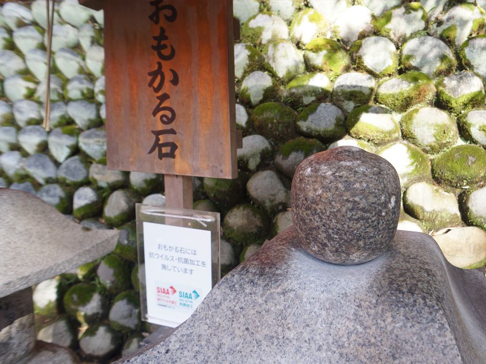 さらに奥社奉拝所の右側後ろにあるのが有名な「おもかる石」。 見た目は普通の石灯篭ですが、この灯篭に載っている石を持ち上げて、思っていたより軽いと感じれば願いが叶い、重いと感じれば願いが叶うのは難しいという、占いのような意味を持つ石です。