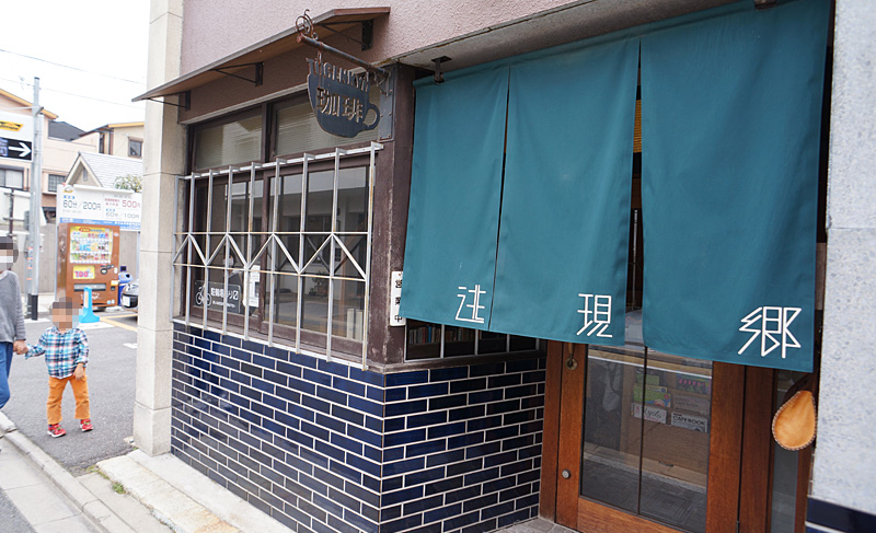 昭和を感じさせるタイル貼りの外壁と、深緑色ののれんが特徴的なカフェ。