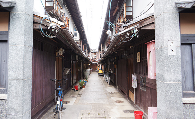この三上家路地には、現在でも唯一残る織元「三上家」が、かつて西陣織の職人を住まわせていた築130年の歴史を持つ長屋が残されています。