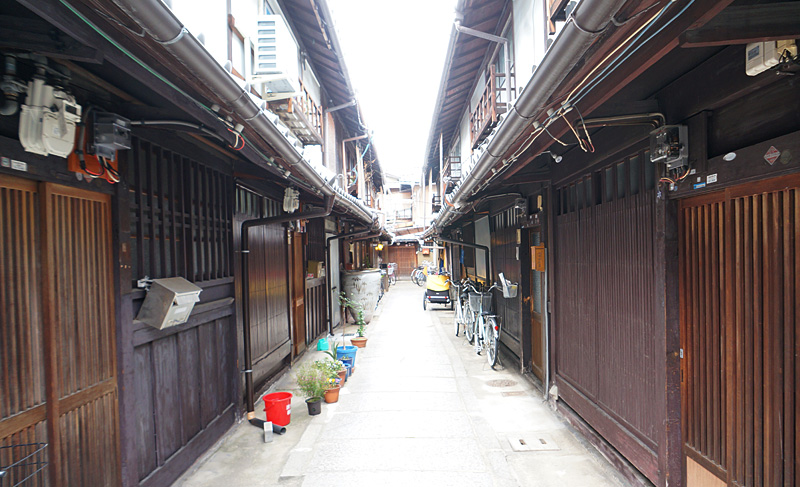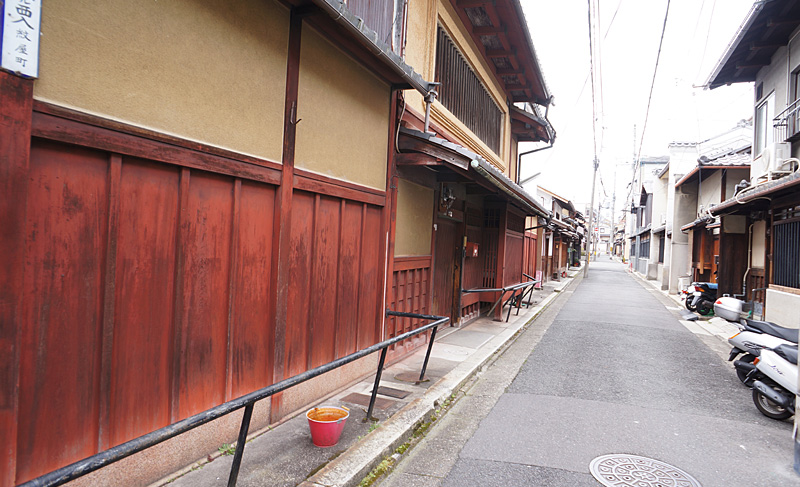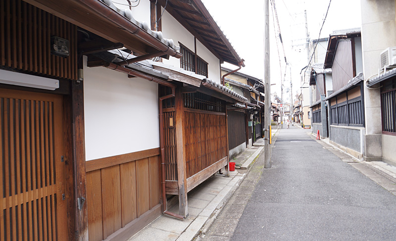 紋屋図子には三寧坂や花見小路通のような、犬矢来や駒寄せなどがある京町屋らしい町屋は見られませんが、西陣の町で多く見られる格子が特徴的な職人長屋風の建物が残っています。