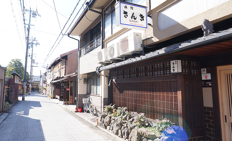 花屋町通に戻り西へ少し行くと、すぐ左手に見えてくる大きな京町屋は「きんせ旅館」。