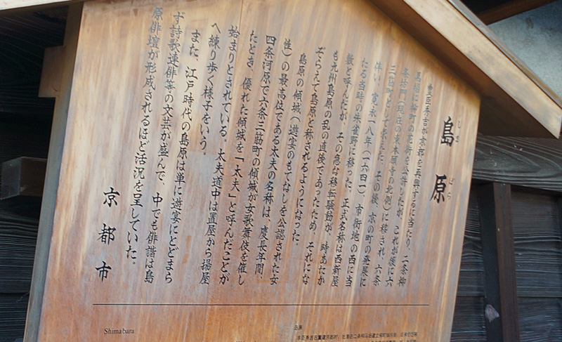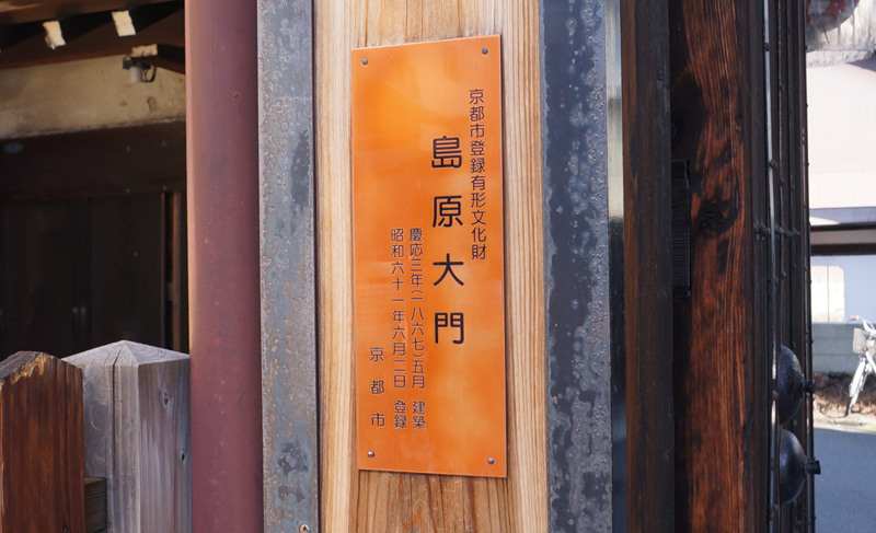 この島原は、京都市中央卸売市場の東側に位置する西新屋敷地区のことで「島原大門(しまばらおおもん)」から「角屋(すみや)」までの約200mほどに町屋が点在しています。