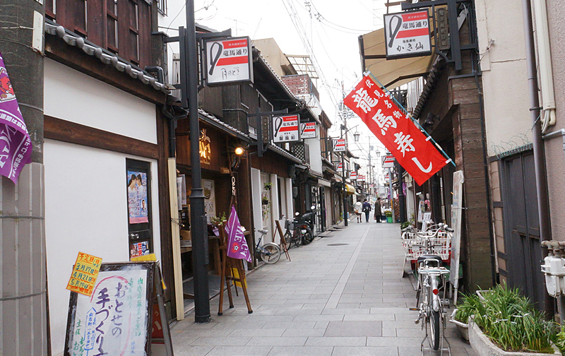 竜馬通り商店街は、寺田屋の東側にある「蓬莱橋」から北へ約130mほど続く商店街で、1996年ごろから景観を統一させるための整備事業が行われ、美しい街並みに生まれ変わっています。 昭和を感じさせる昔ながらの風情ある白壁基調、町家風建物、石畳舗装・ガス灯風街路灯建設・和風の統一看板など、風情ある京の下町といった感じです。
