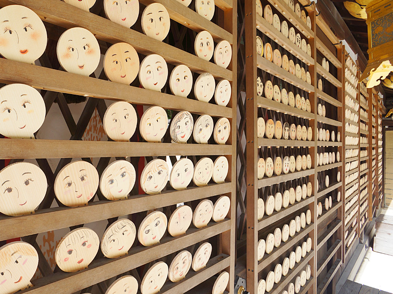これは手鏡の形をした、表面に顔が描かれた絵馬を自分の顔に見立て、普段使っているメイク道具でお化粧して裏面に願い事を書くというもの。この絵馬を奉納すると内面も外面も美しくなれるんだとか。もしメイク道具を持ち合わせていなくても、神社内の「鏡絵馬御化粧室」の中に、貸出用のクレヨンや色鉛筆が用意されているので安心です。ちなみに裏面に描かれている模様は「二葉葵(ふたばあおい)」と言い、下鴨神社のご神紋で「神様の力」と「神様と会う」ことを意味しているそうです。