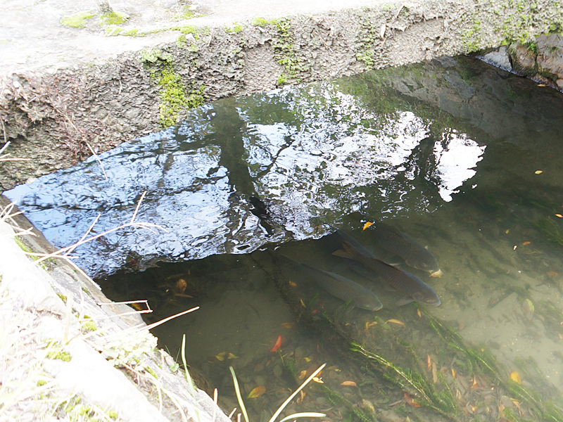 水がきれいなため小川には、水深は浅い割にとても大きなコイが背びれを少し水面に出したまま、たくさん泳いでいるのが見えます。